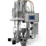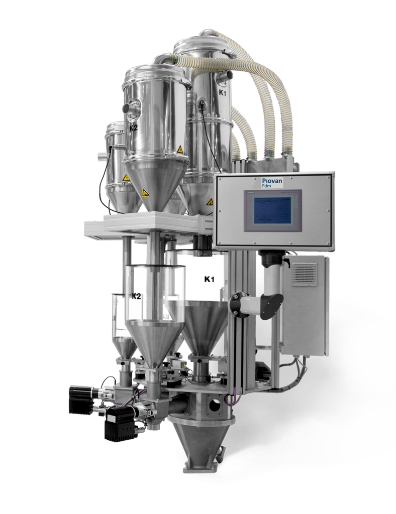 Das Gerät befindet sich oberhalb des Extrudereinlaufs und wird über Vakuumabscheider beschickt.